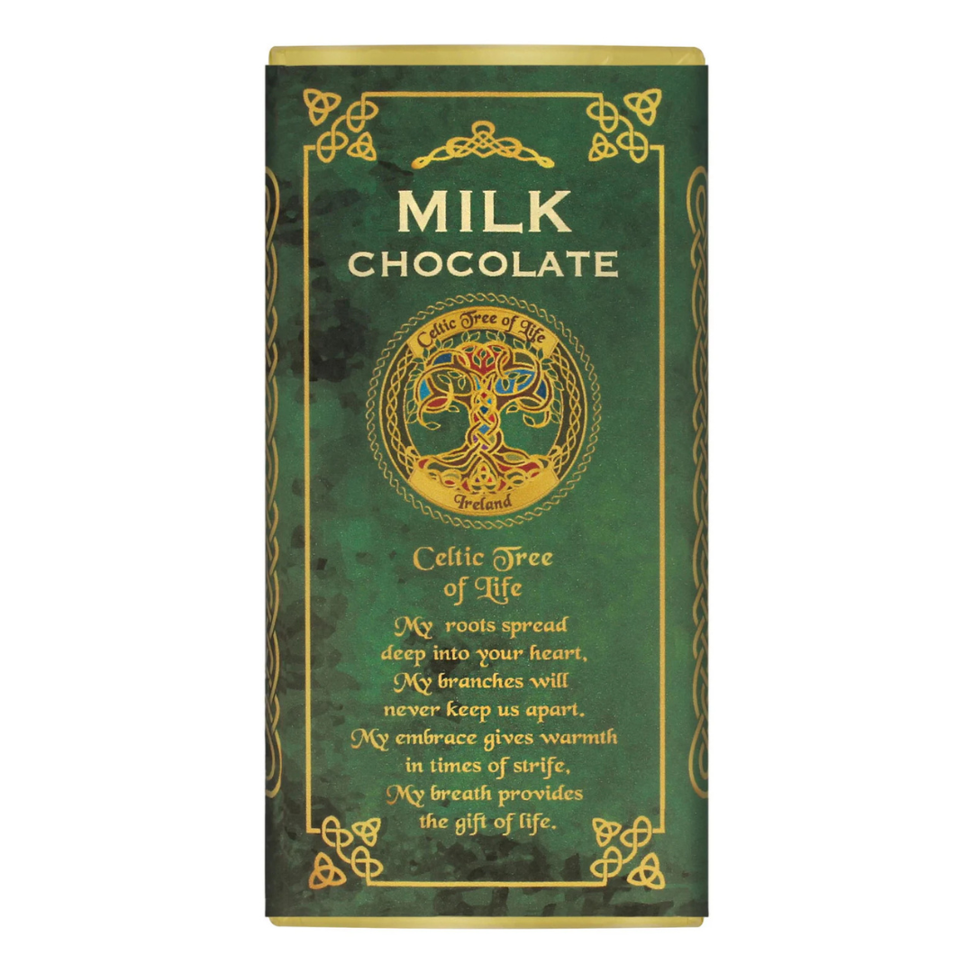 This Celtic Tree Of Life milk chocolate bar features elegant green and gold packaging adorned with Celtic illustrations and the Tree of Life motif, celebrating Irish heritage in every bite.