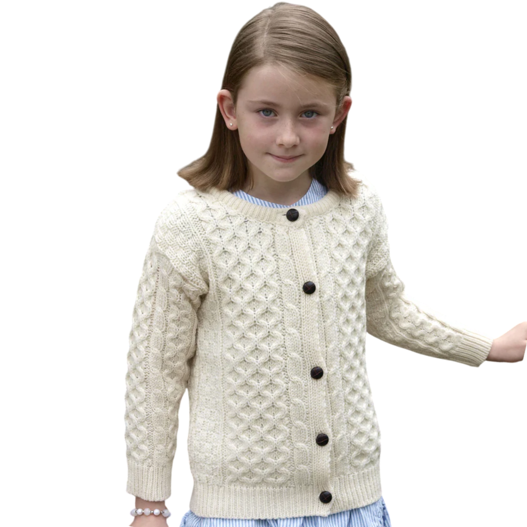 Wrap your little one in timeless charm with this traditional Aran cardigan, crafted from 100% extra-soft Merino Wool. Featuring classic cable and basket stitches, wooden-style buttons, and a cozy crew neck, it blends Irish heritage with everyday comfort.