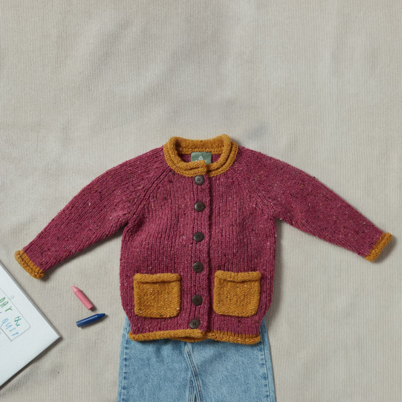 Keep your little one cozy in this charming roll neck cardigan, crafted from 100% Donegal wool. Featuring colorful contrast details, handy patch pockets, and natural coconut buttons, it blends Irish craftsmanship with comfort and timeless style.