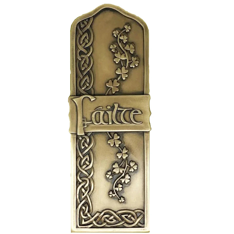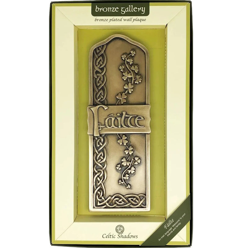 Welcome guests with this stunning "Fáilte" bronze wall plaque, featuring an elegant shamrock veil and intricate Celtic designs. The embossed "Fáilte" in the center symbolizes Irish hospitality, making it a perfect addition to your home or a thoughtful gift. Durable and beautifully crafted, this plaque adds a touch of Ireland’s warmth to any space.