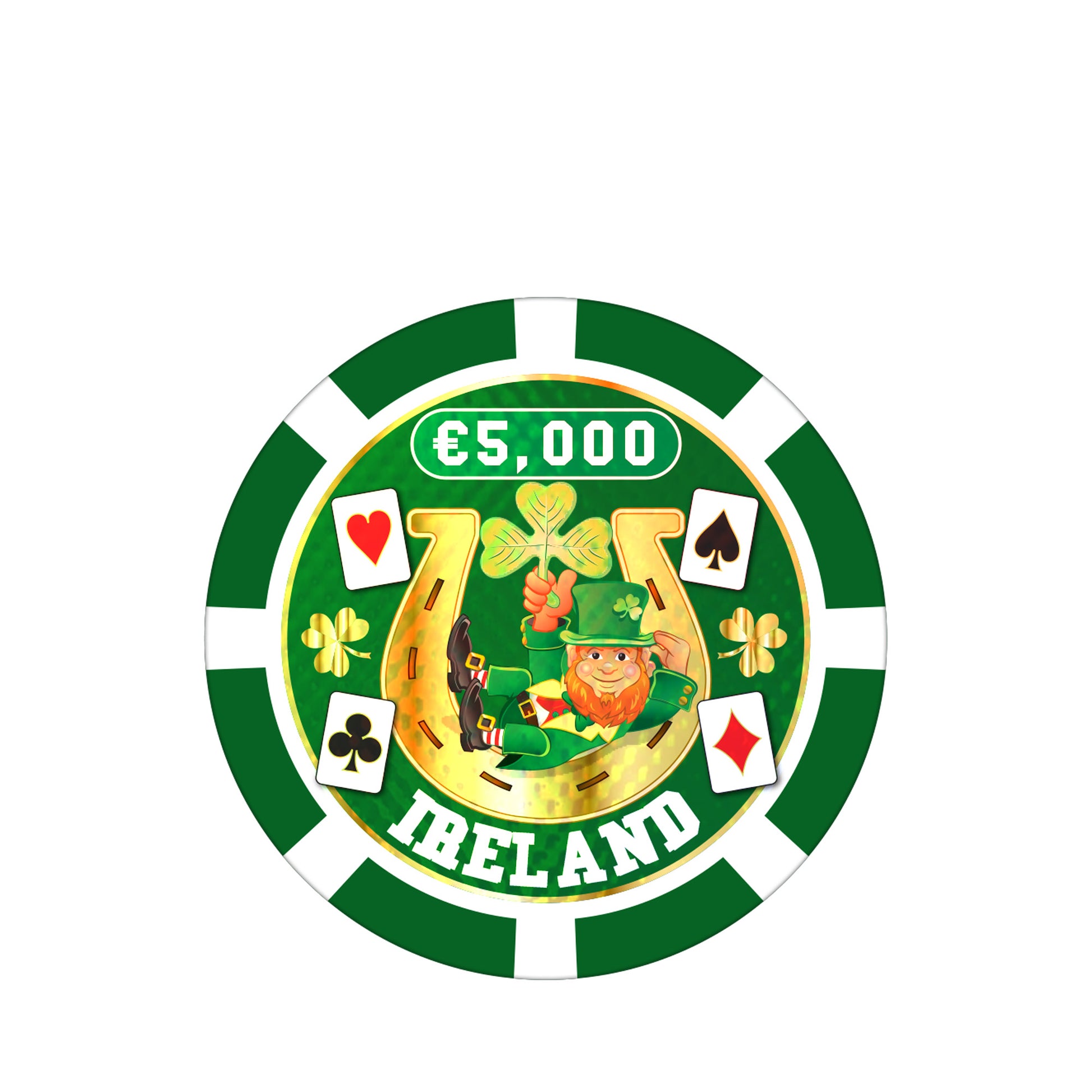 Add a touch of fun and Irish charm to your collection with this novelty Ireland 5000 Euro Casino Chip. Featuring a bold shamrock on a horseshoe at the center, it's designed exclusively for Carroll's Irish Gifts and makes a unique keepsake or playful gift.