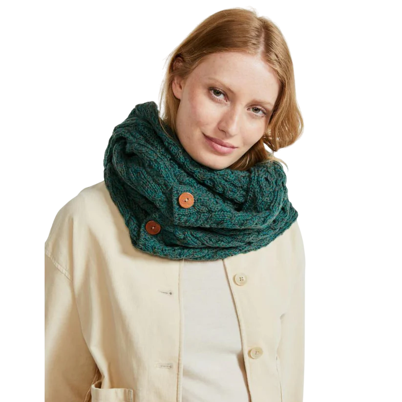 Ladies Buttoned Aran Connemara Green Snood Scarf