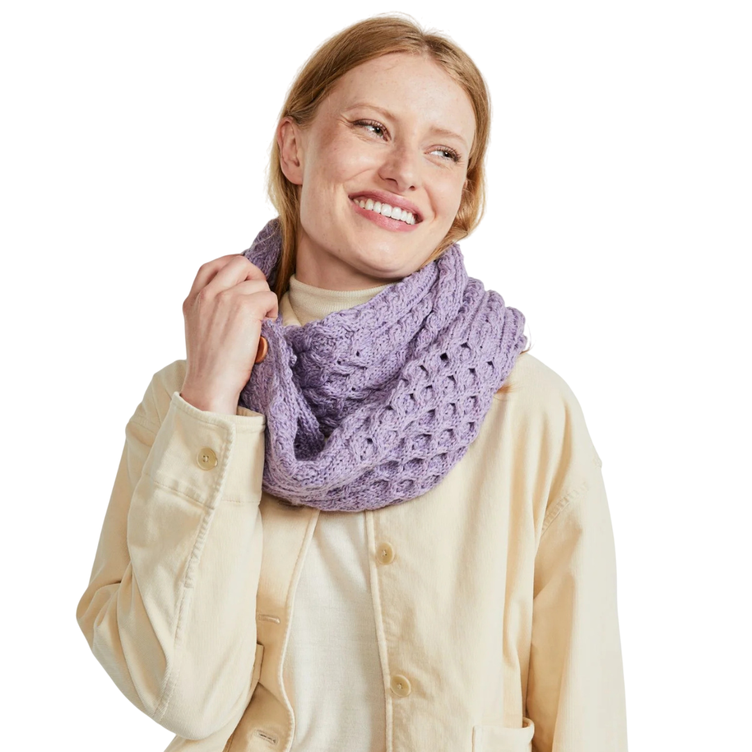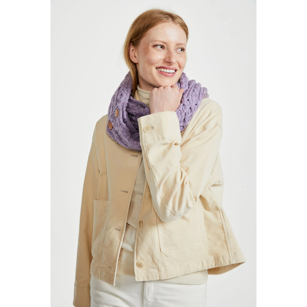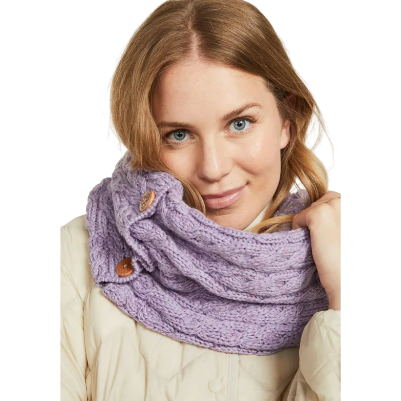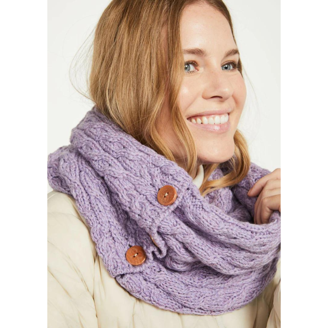 This gorgeous wool snood scarf is elegantly weaved with a diamond stitch; a traditional design among Irish fishermen. It has five brown wooden buttons to close and add to the design. It is part of the Aran Woollen Mills range and is made using 100% Merino wool.
