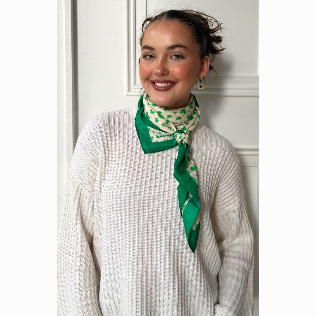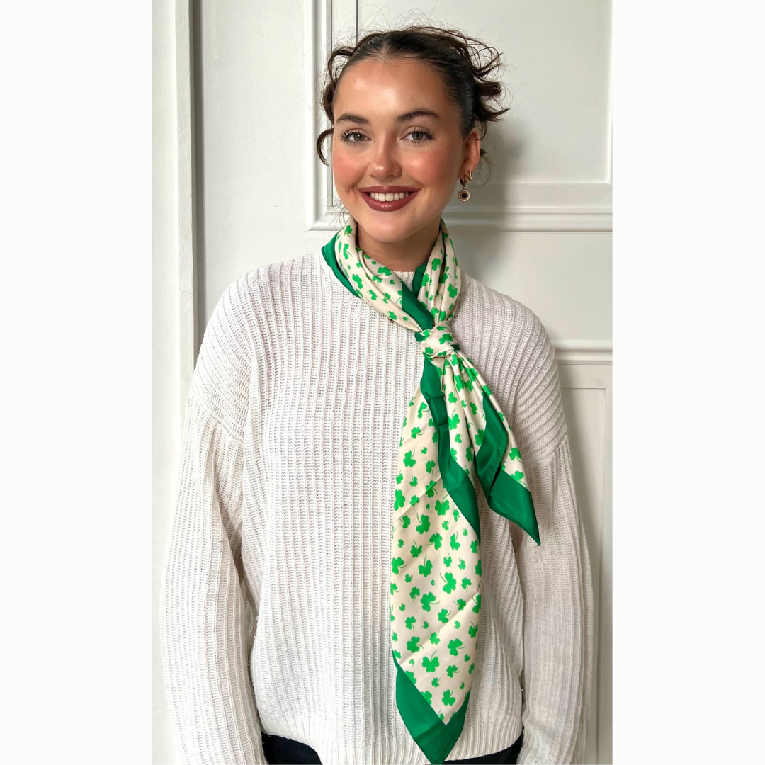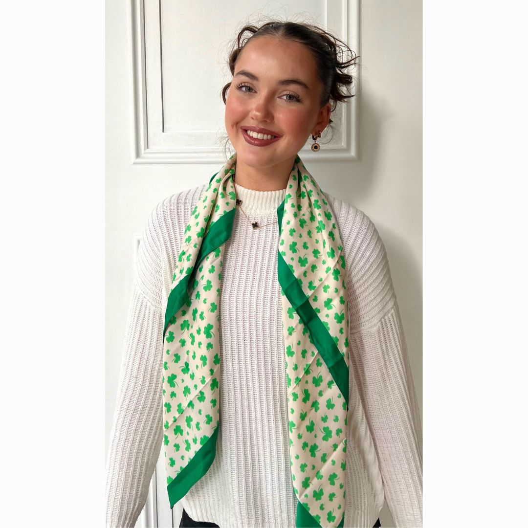This elegant polysilk scarf showcases a green and cream shamrock design. Its compact length allows for versatile styling, perfect for adding a touch of Irish charm.