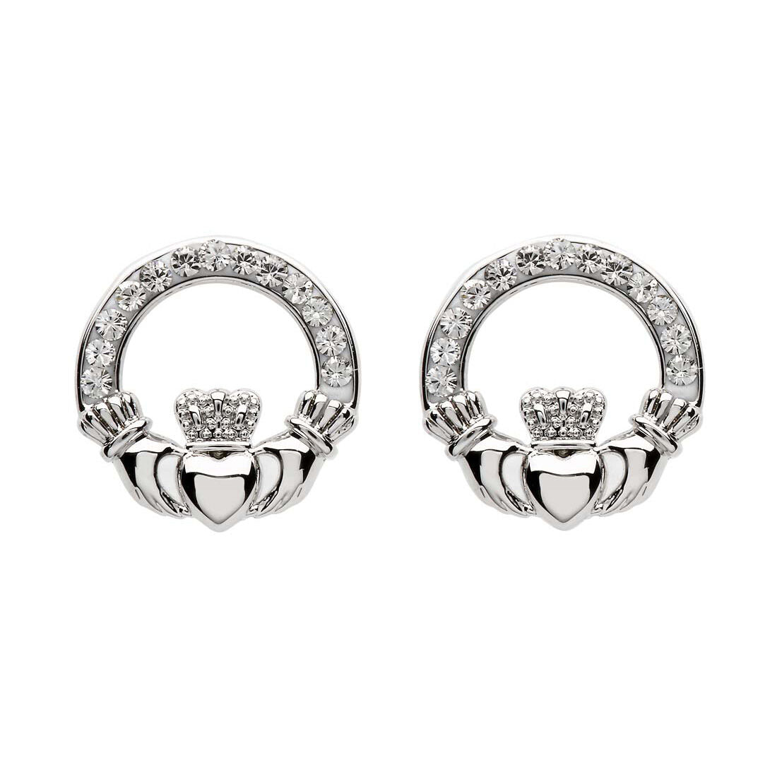 Platinum Plated Claddagh Stud Earrings With Clear Crystals