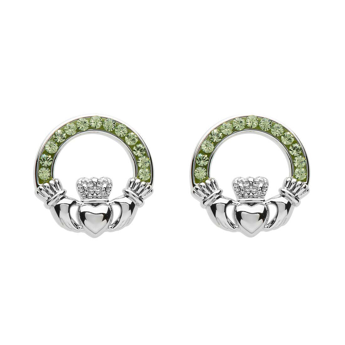 Platinum Plated Claddagh Stud Earrings With Peridot Crystals