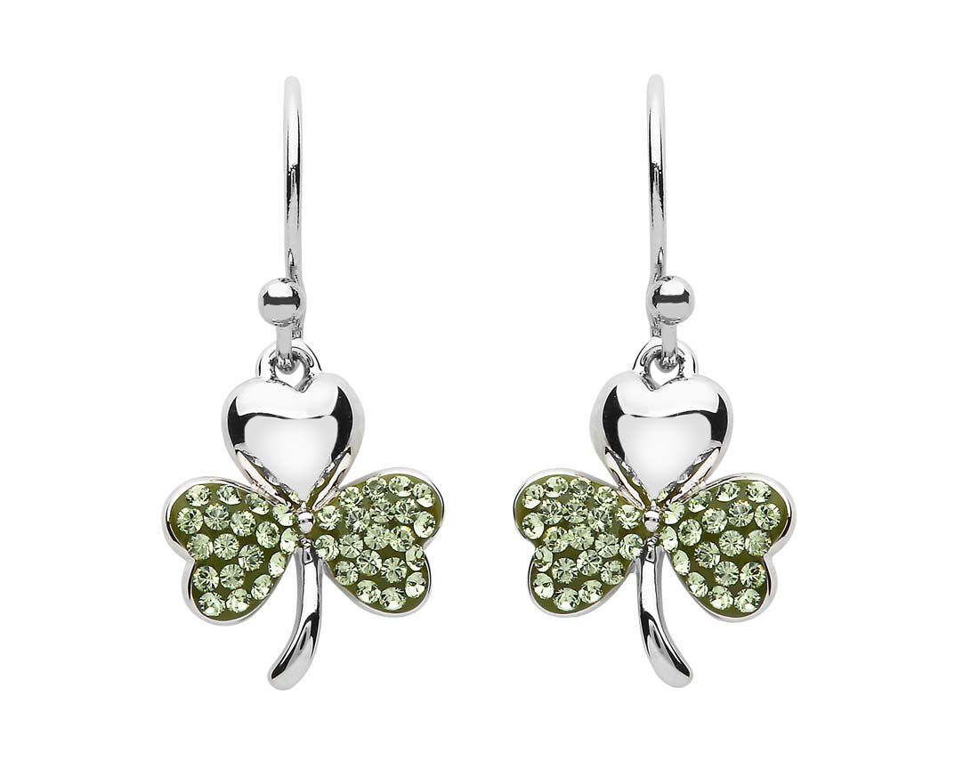 Platinum Plated Small Shamrock Leaf Drop Earrings With Peridot Crystals