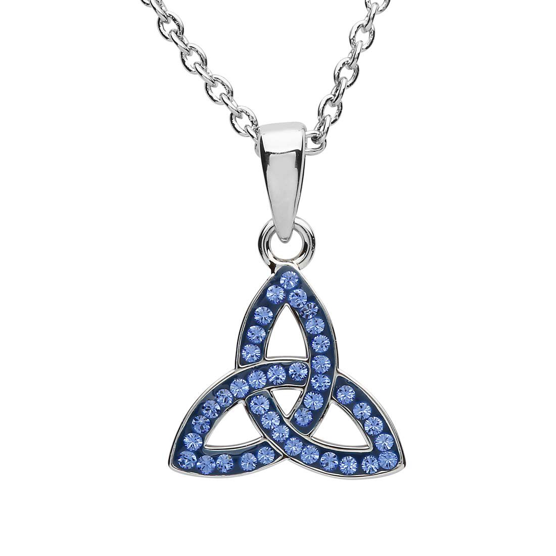 Platinum Plated Trinity Knot Necklace With Blue Crystals