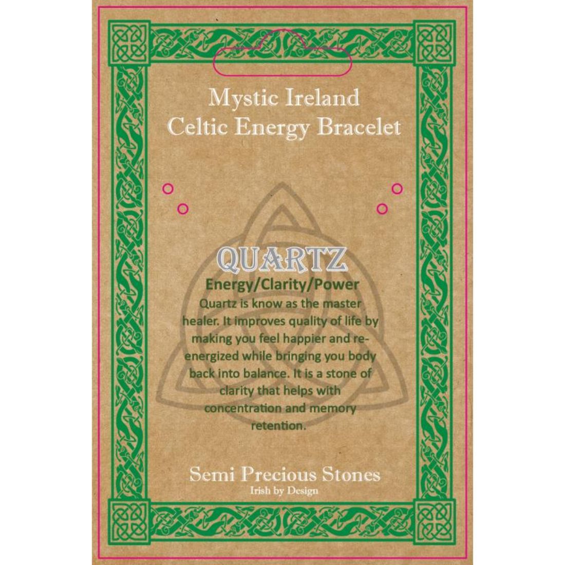 If you are looking for a unique gift these bracelets are a great choice! This Celtic Energy bracelet features Quartz beads. Quartz is known as the master healer. It improves quality of life by making you feel happier and re-energized while bringing your body back into balance. It is a stone of clarity that helps with concentration and memory retention. Irish Mystery Myth and Magic