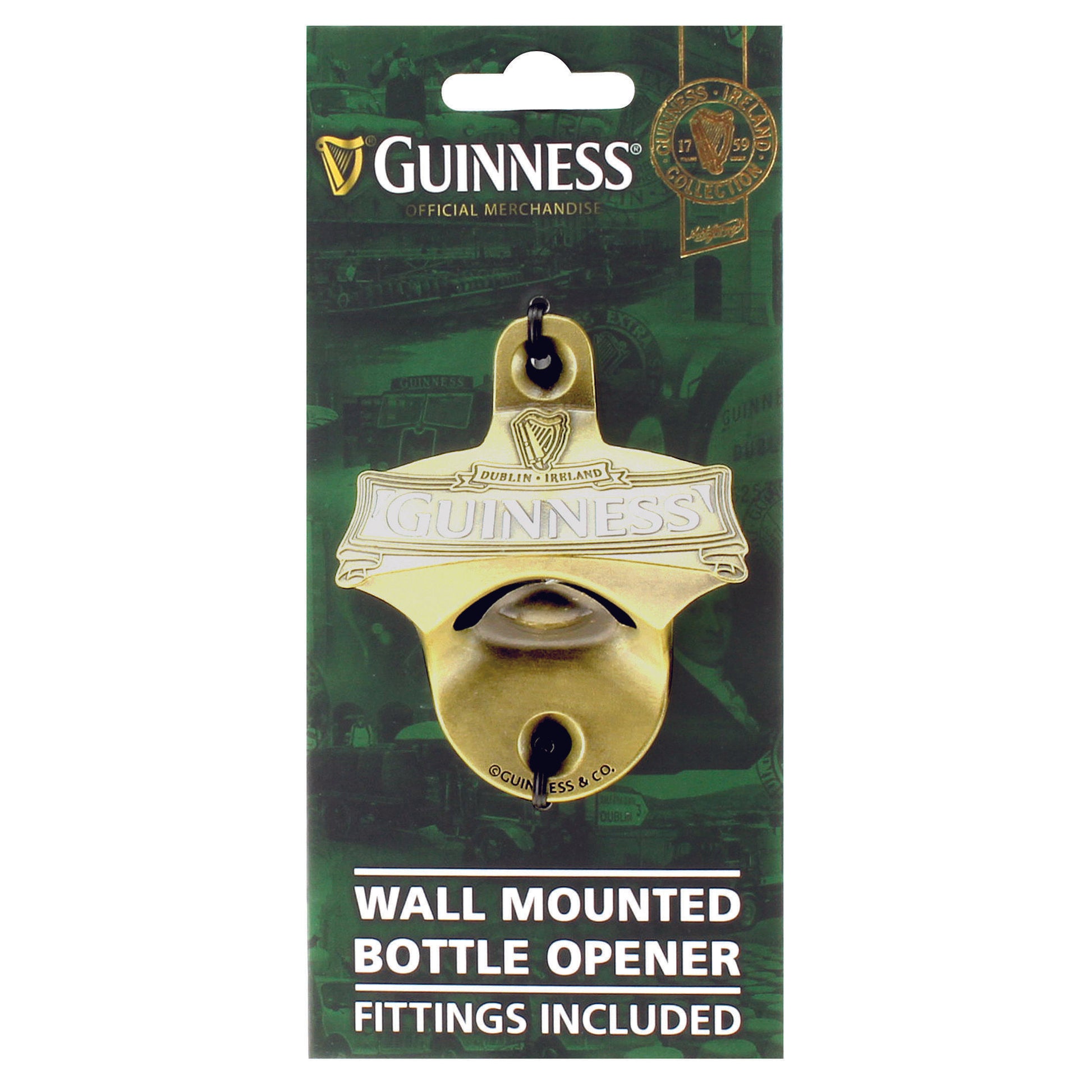 This wall mounted bottle opener from Guinness comes from their Ireland Collection. The wall mounted bottle opener is designed with the words Guinness St. James Gate Dublin.