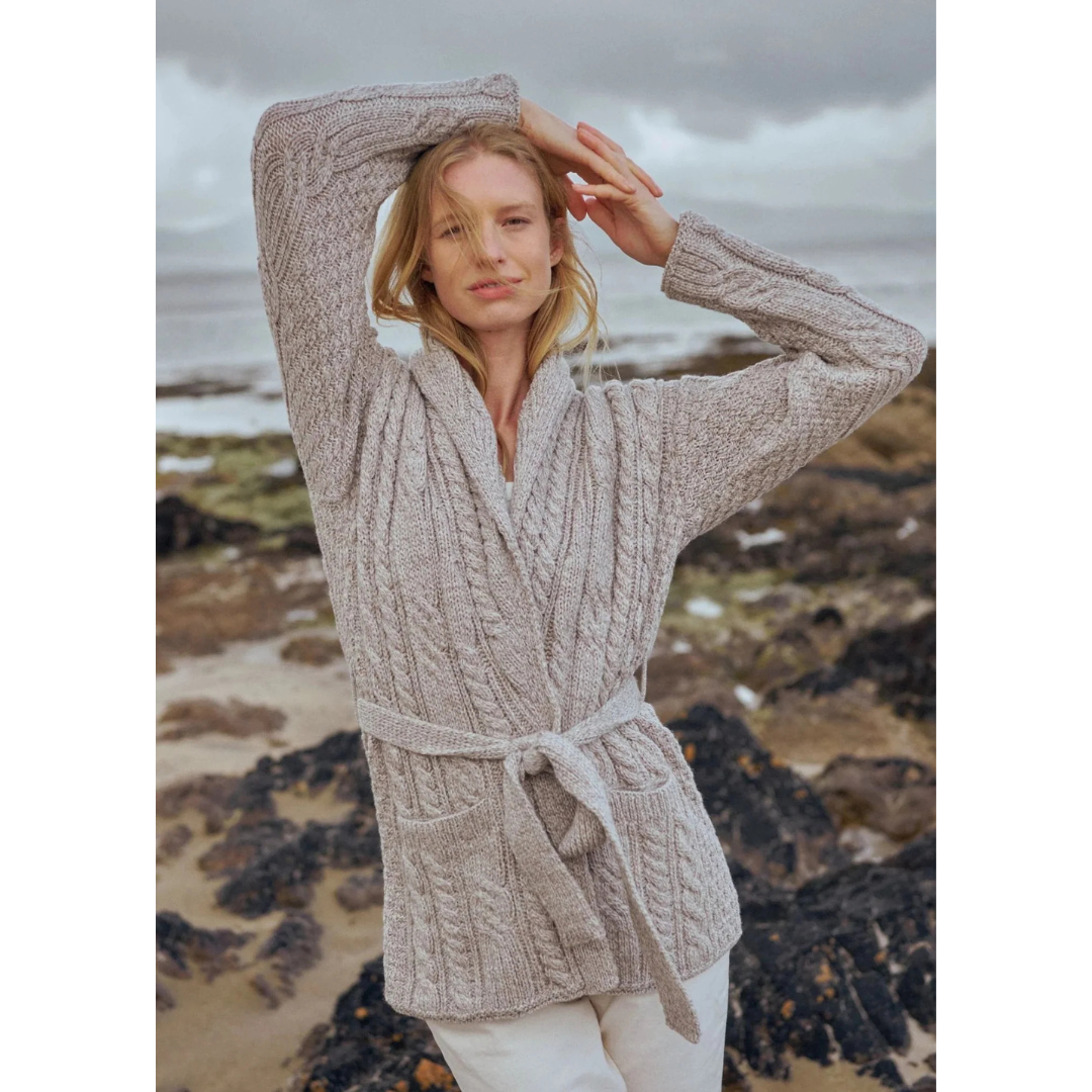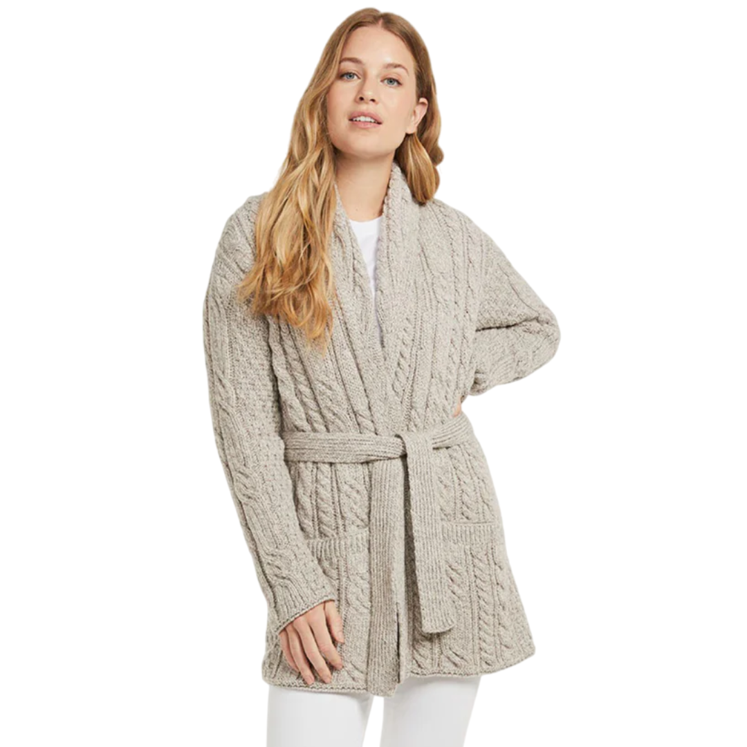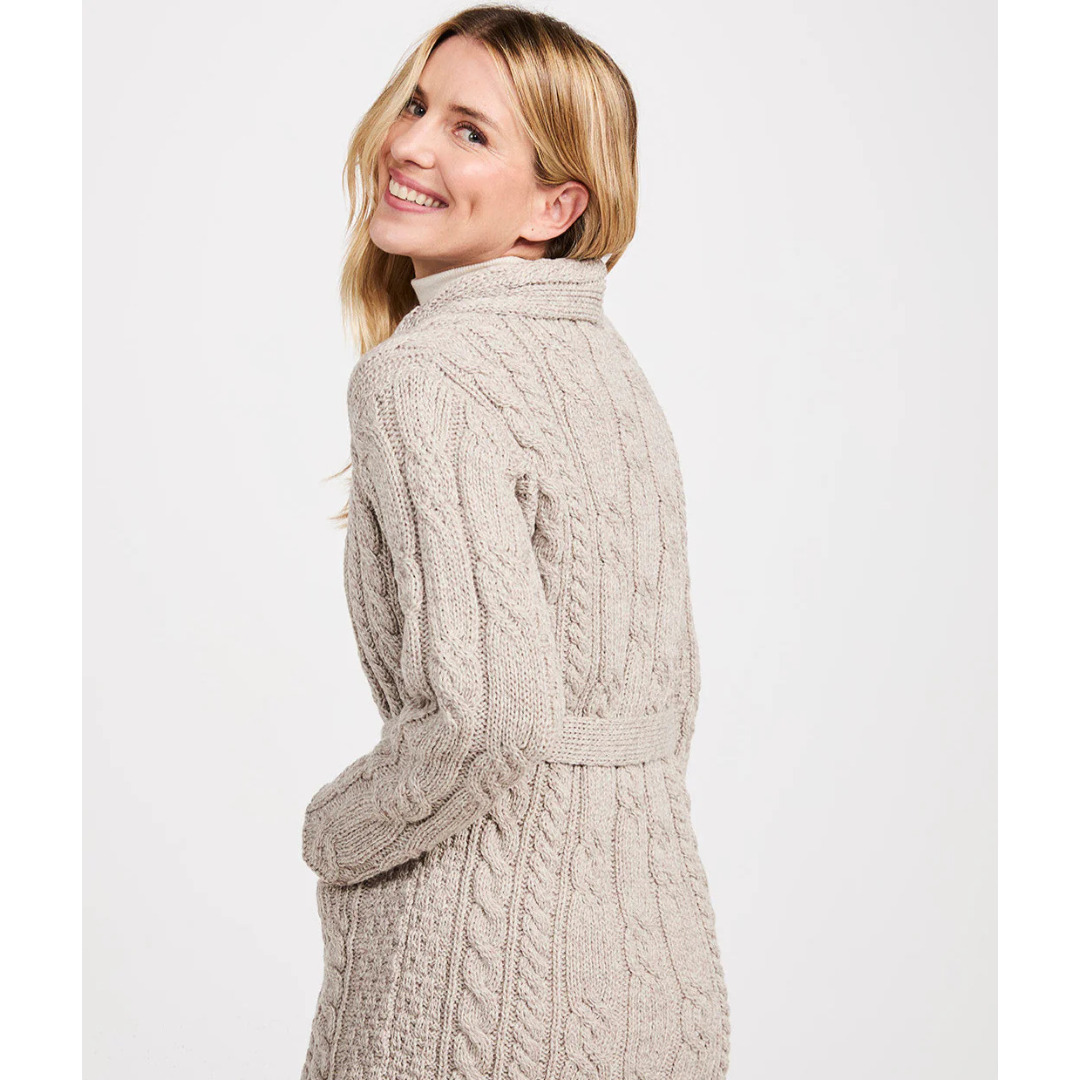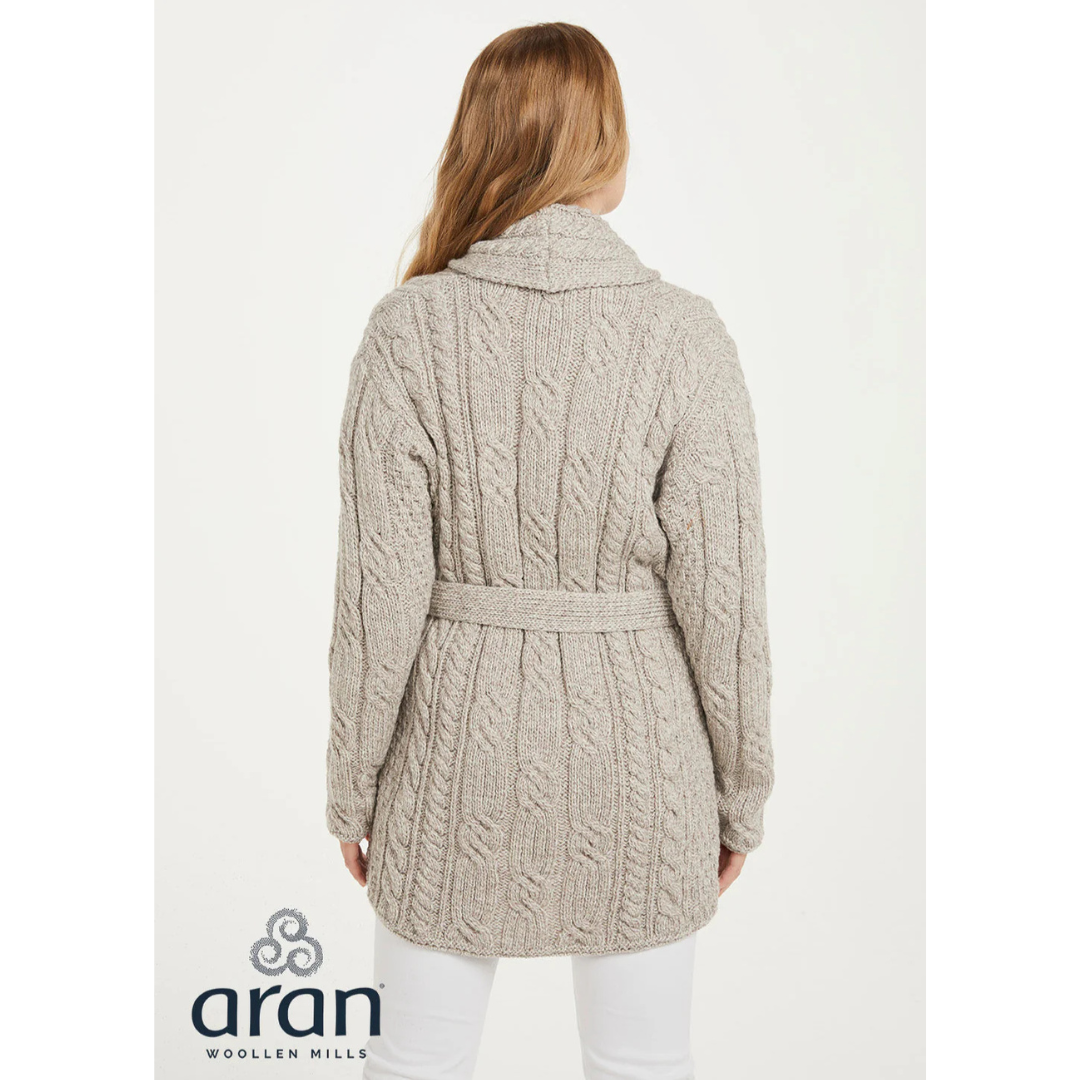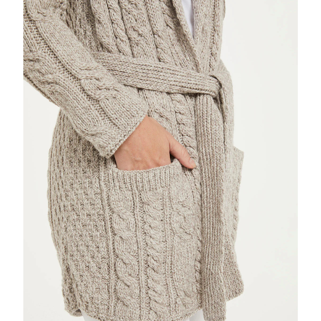 Ladies Aran Shawl Neck Belted Oatmeal Cardigan