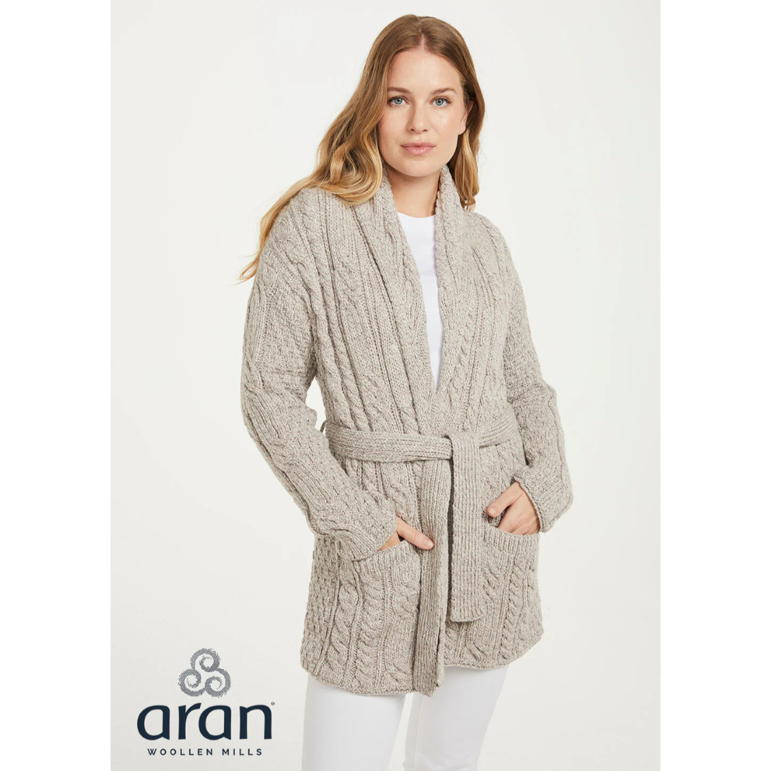 Add a touch of coziness to your wardrobe with our Shawl Neck Aran Belted Cardigan. Crafted in Ireland from 100% Supersoft Merino Wool, this stylish piece features a classic shawl collar, intricate cable stitch patterns, and a flattering belted waist. Moss stitch detailing along the sides and inner sleeves provides a refined finish. Perfect for layering during colder months, this 5-gauge knit cardigan pairs beautifully with a simple white top and jeans for an effortlessly chic look.